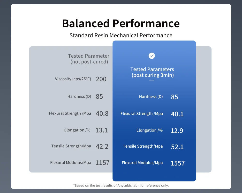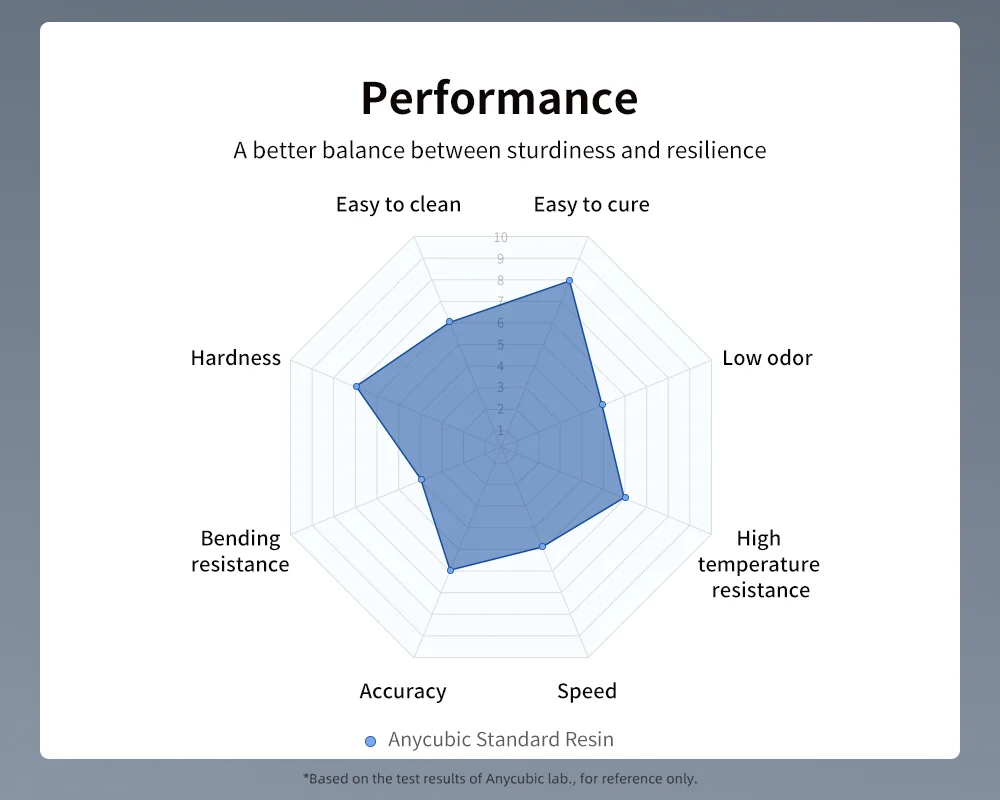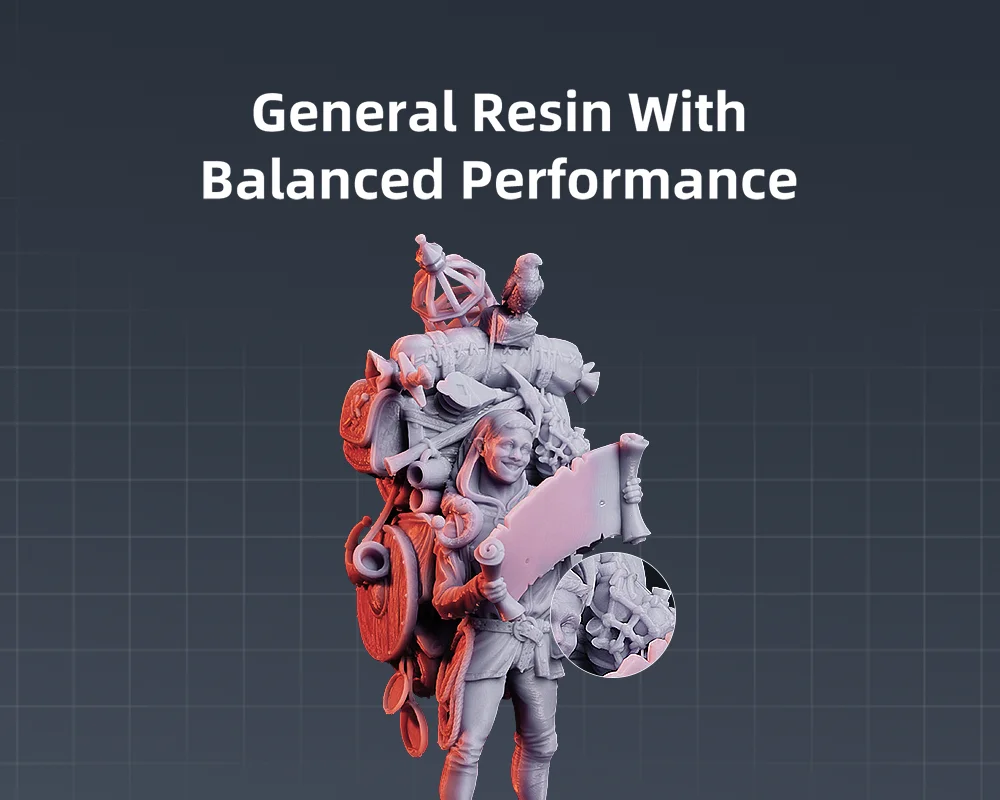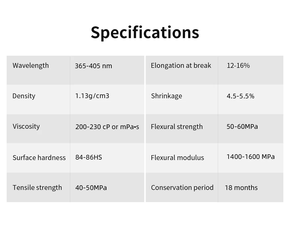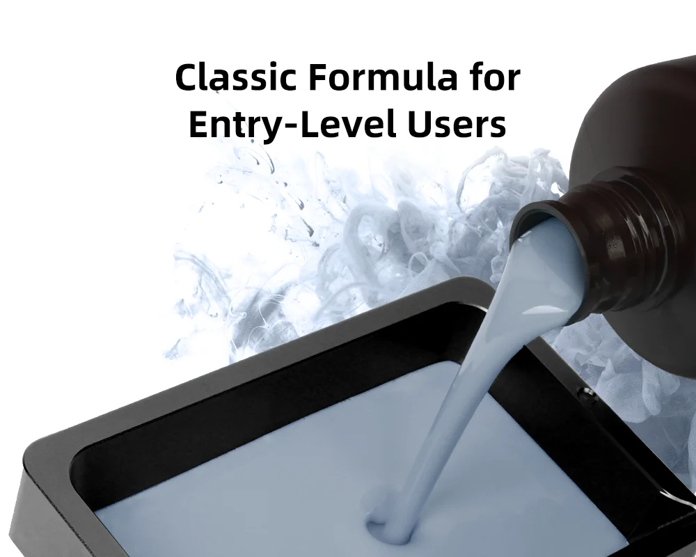 Como a resina mais vendida, a resina padrão oferece desempenho equilibrado em termos de taxa de sucesso de impressão, aderência ao leito de impressão, detalhes do modelo, precisão de impressão, dureza, resiliência, cheiro, fluidez e facilidade de limpeza.